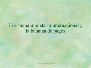El documento describe el sistema monetario internacional a través de la historia, incluyendo el patrón oro, el sistema de Bretton Woods y el sistema de tasas de cambio flotantes actual. También explica conceptos como la balanza de pagos, el Fondo Monetario Internacional y los mercados de divisas.