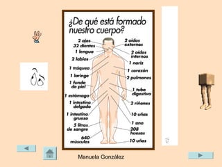 El documento presenta información sobre los principales huesos, músculos, aparatos y sentidos del cuerpo humano. Se mencionan los huesos, músculos y los aparatos digestivo, respiratorio, circulatorio y excretor. También se describen los cinco sentidos: vista, oído, olfato, gusto y tacto. El documento incluye preguntas sobre los órganos que componen cada sistema.