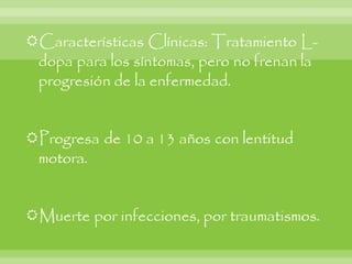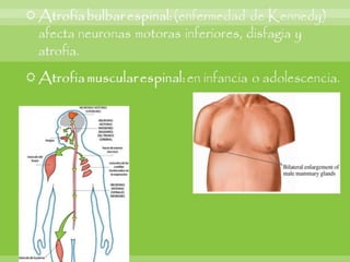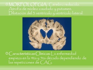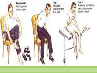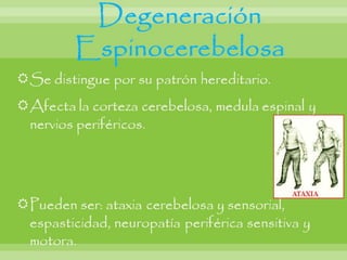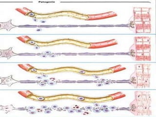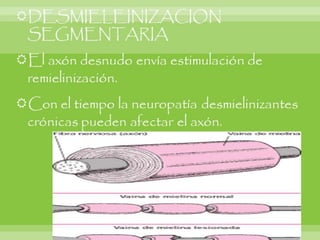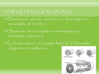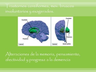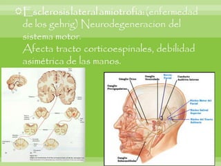 Este documento resume varias enfermedades neurodegenerativas y demencia, incluyendo la enfermedad de Alzheimer, la demencia frontotemporal, la enfermedad de Parkinson y la enfermedad de Huntington. Describe las causas, síntomas y hallazgos morfológicos y microscópicos de cada una. También cubre enfermedades del sistema nervioso periférico como el síndrome de Guillain-Barré, que causa debilidad muscular progresiva y puede ser fatal. El documento provee una visión general de las principales enfermed