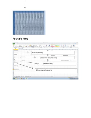 Este documento presenta diferentes funciones en Excel para realizar cálculos financieros y tablas de multiplicar. Explica cómo usar funciones como ALEATORIO, MULTIPLICACIÓN, AHORA, CÓDIGO y PAGO para generar números aleatorios, multiplicar cantidades y precios, mostrar fechas y horas, buscar nombres en una lista y calcular pagos. También muestra cómo crear tablas de multiplicar para enseñar a los estudiantes a multiplicar y utilizar fórmulas en Excel.