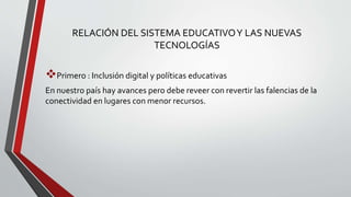 El documento discute la relación entre el sistema educativo y las nuevas tecnologías. Primero, señala que si bien hay avances en inclusión digital en el país, deben revertirse las deficiencias de conectividad en áreas con menos recursos. Segundo, explica que los desafíos de introducir las TIC en las escuelas incluyen transformaciones en las estructuras y en quienes imparten conocimiento con respecto a las tecnologías, y que el sistema escolar debe romper con estructuras tradicionales debido a los cambios simbólicos