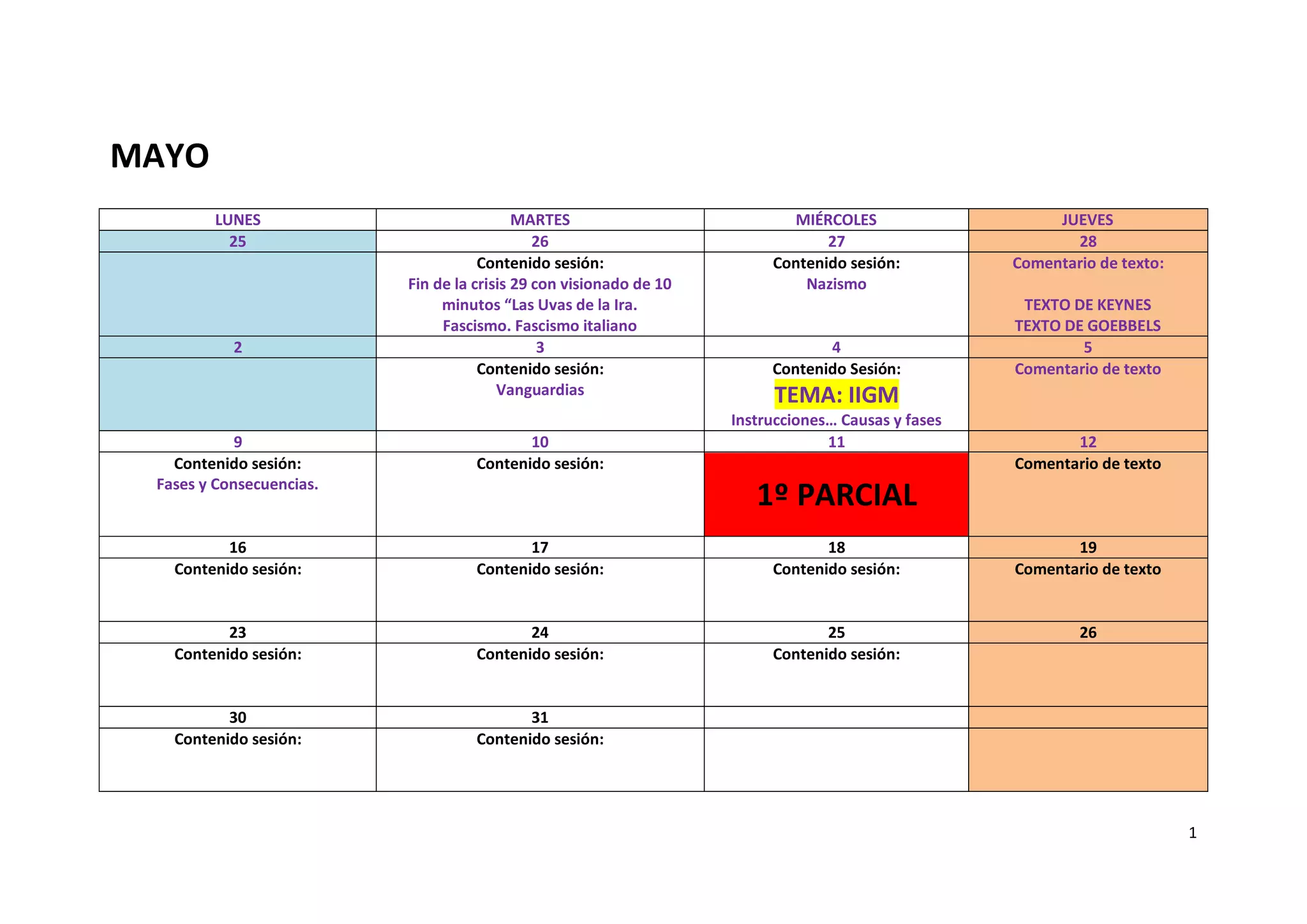 Este documento presenta el calendario de mayo y junio con las fechas y contenidos de las sesiones de una asignatura. En mayo, las sesiones cubren temas como el fascismo en Italia, la II Guerra Mundial, las vanguardias artísticas y las fases y consecuencias de la guerra. También hay comentarios de textos de Keynes y Goebbels. En junio, las sesiones continúan con más contenidos hasta los exámenes parciales y finales, incluyendo una recuperación y la entrega de un trabajo final.