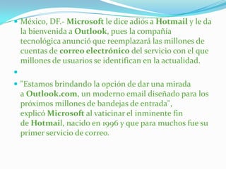 Microsoft anunció que reemplazará el servicio de correo electrónico Hotmail con Outlook.com, ofreciendo a los usuarios de Hotmail la opción de migrar sus cuentas, direcciones de correo, contraseñas, contactos y correos a Outlook.com sin perder información. El cambio principal es estético, con una interfaz más limpia en Outlook.com que se integra mejor con Windows 8.