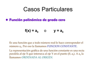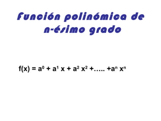 Este documento describe diferentes tipos de funciones polinómicas, incluyendo funciones constantes, lineales, cuadráticas y de grado mayor. Explica cómo graficar funciones polinómicas encontrando primero sus raíces mediante el uso de fórmulas como la fórmula cuadrática o el teorema de Gauss para funciones de grado mayor. Proporciona un ejemplo detallado de cómo encontrar las raíces de una función polinómica de grado 3.