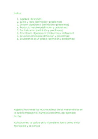 El documento presenta una introducción al álgebra, incluyendo definiciones de términos algebraicos, exponentes, grado, suma, resta, división algebraica, productos notables, factorización y fracciones algebraicas. También incluye ejemplos y problemas resueltos de cada uno de estos temas.