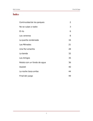 El documento presenta fragmentos de 'Final del juego' de Julio Cortázar, explorando la complejidad de las relaciones humanas y situaciones cotidianas cargadas de simbolismo. A través de las narraciones, los personajes enfrentan sus deseos, temores y la lucha por la libertad en un ambiente cargado de tensión y emociones intensas. La prosa de Cortázar destaca por su habilidad para crear ambientes únicos y profundizar en la psicología de los personajes.