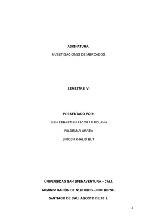 Este documento presenta la investigación de mercados realizada para el desarrollo de un plan de negocios para un restaurante de almuerzos gourmet controlados en Cali. Se realizaron entrevistas cualitativas y una encuesta cuantitativa para identificar la demanda potencial, características del consumidor, factores que afectan el consumo de este tipo de almuerzos y determinar un precio aceptable. Los resultados mostraron interés en los almuerzos saludables, especialmente entre estratos altos interesados en controlar su salud.
