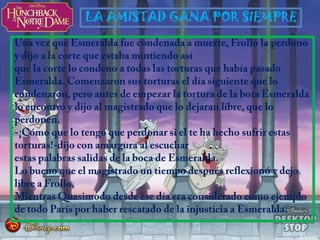 Este documento anuncia un concurso de blogueo sobre comunicación integral, supervisado por la tutora Miss Rosa Arévalo Guzmán. Los participantes deben crear un final alternativo para la historia de Esmeralda y Quasimodo, donde la amistad prevalece por siempre.