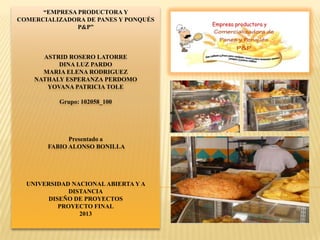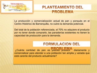 Este documento describe un proyecto para crear una panificadora en el centro histórico de Barranquilla para satisfacer la alta demanda insatisfecha de pan en la zona. Se realizó un estudio de mercado que encontró que actualmente sólo se cubre el 30% de la demanda. El proyecto incluye un plan de negocios con detalles sobre la inversión requerida, el personal, la ubicación y los productos a ofrecer. El objetivo es producir pan de alta calidad a bajo precio para los residentes del área.