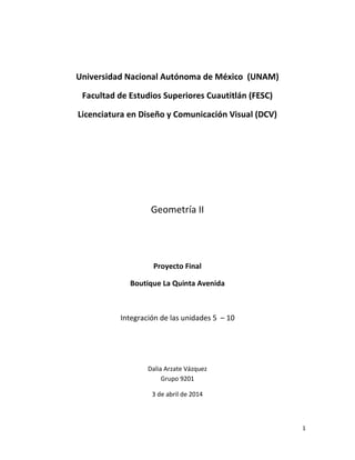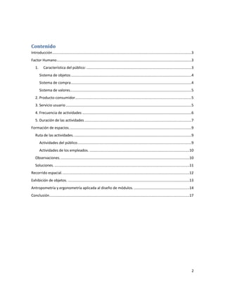 Este documento resume un proyecto de diseño para mejorar la boutique La Quinta Avenida. Describe las características del público, las actividades realizadas, y propone soluciones como agregar asientos, usar materiales naturales, y mejorar la exhibición de objetos para crear un espacio más cómodo y atractivo para los clientes.