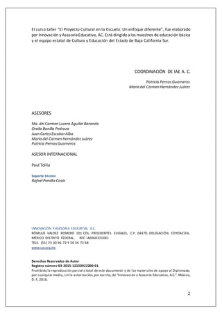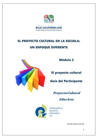 El documento describe un taller sobre proyectos culturales en las escuelas impartido por Innovación y Asesoría Educativa. El taller está dirigido a maestros y funcionarios educativos de Baja California Sur. Se explican los objetivos generales y específicos del taller, que incluyen promover la cultura en las escuelas para desarrollar prácticas docentes que incorporen la diversidad e impulsen el trabajo colaborativo a través de proyectos culturales. El documento también presenta el contenido y actividades de los módulos del taller sobre plane