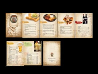 Este documento describe los colores y tipografía utilizados en el diseño de una carta de menú para un restaurante-bar. Se utilizan los colores naranja, amarillo y rojo, y se explica el significado y efectos de cada color. La tipografía seleccionada es Kontra Punkt en diferentes estilos y tamaños para los diferentes elementos del menú. El documento también incluye pruebas de la combinación de colores y tipografía antes del diseño final.