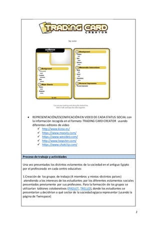 Este documento describe un proyecto entre escuelas para que estudiantes aprendan sobre la sociedad del antiguo Egipto. Los estudiantes se dividirán en grupos internacionales para investigar y representar uno de los diferentes estamentos sociales egipcios. Los grupos crearán tarjetas informativas digitales, videos de representación y publicarán sus hallazgos en un blog del proyecto para presentar una visión completa de la sociedad egipcia.