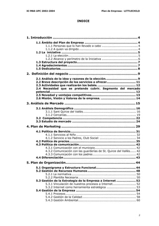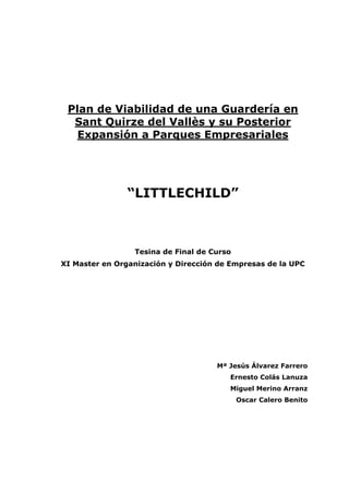 Este documento presenta un plan de viabilidad para una guardería en Sant Quirze del Vallès y su posterior expansión a parques empresariales. El plan fue desarrollado por 4 estudiantes de un Master en Dirección y Organización de Empresas de la UPC como parte de un proyecto académico, con la orientación de su tutor. El documento incluye un análisis de mercado, planes de marketing, organización, operaciones, económico-financiero, y expectativas de futuro para la guardería propuesta.