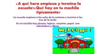 Este documento describe la rutina escolar de un estudiante. Describe que la escuela empieza a las 8 am y termina a las 3 pm. El estudiante tiene 4 clases cada día, con almuerzo de 11:10 am a 12:10 pm. La clase favorita del estudiante es historia, cuyo maestro se llama Sra. Leslie.