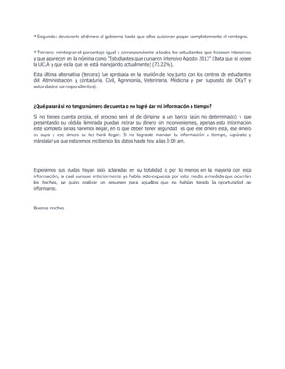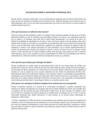 El documento explica el proceso de reintegro de fondos para estudiantes que completaron cursos intensivos en 2013. Debido a limitaciones de los bancos, el dinero será depositado directamente en las cuentas bancarias personales de los estudiantes. Aquellos sin cuenta podrán retirar el dinero en un banco aún no determinado. El reintegro será del 73.22% del monto total debido a que solo se tiene información completa de un porcentaje de estudiantes. El plazo para proveer información bancaria fue extendido hasta las 3 am para asegurar