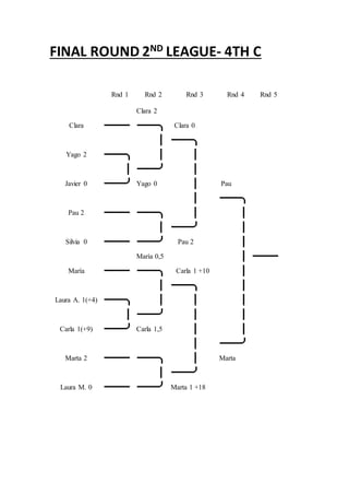 Este documento presenta los resultados de dos ligas de cinco rondas cada una. En la primera liga, Daniel y Pablo ganaron dos rondas cada uno, mientras que en la segunda liga, Clara, Pau y Marta ganaron dos rondas cada una. El documento proporciona los puntajes obtenidos por cada jugador en cada ronda.