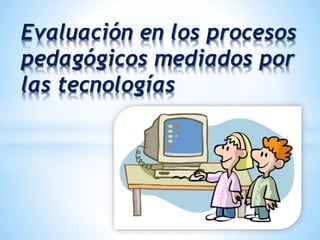 Este documento discute el rol de la evaluación en los procesos pedagógicos mediados por la tecnología. Explica que la evaluación obtiene información sobre el aprendizaje y la enseñanza para ayudar a los estudiantes a construir su propio conocimiento. También promueve la autoevaluación de profesores y estudiantes para mejorar el proceso de enseñanza-aprendizaje. Finalmente, analiza las ventajas y desventajas del uso de las tecnologías de la información y la comunicación en la educación.