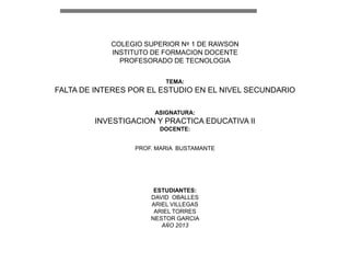 Este documento discute las causas de la falta de interés en el estudio entre estudiantes de nivel secundario y posibles estrategias para abordar este problema. Propone que tanto los docentes como los padres deben tomar iniciativas para estimular el interés de los estudiantes, por ejemplo, los docentes impartiendo clases de calidad con calidez y formando vínculos afectivos, y los padres motivando a sus hijos para que se interesen por los estudios.