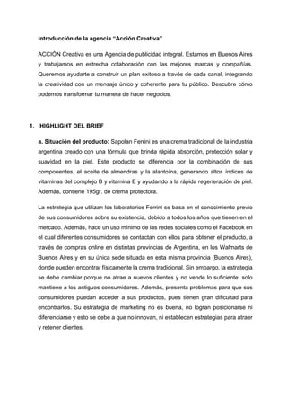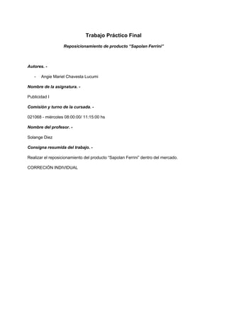 Este documento presenta un proyecto de reposicionamiento de la crema Sapolan Ferrini. Actualmente el producto no logra posicionarse ni diferenciarse debido a que no ha innovado. El objetivo es mejorar la comunicación con el público para atraer nuevos clientes y lograr otro posicionamiento entre los competidores. El target principal son mujeres de 24 a 45 años de clase media-baja. Se propone cambiar el diseño del envase y la estrategia de marketing, enfocándose en resaltar el bajo precio y facilidad de acceso al producto.