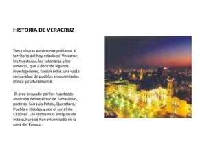 Tres culturas autóctonas poblaron el territorio de Veracruz: los huastecos, los totonacas y los olmecas. Los huastecos habitaban desde el sur de Tamaulipas hasta el río Cazones, en el sur. Los climas predominantes en Veracruz son cálido subhúmedo y cálido húmedo. El documento también incluye un mapa de Veracruz con rutas y municipios.