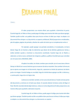 El documento proporciona instrucciones sobre cómo usar las funciones de diseño y formato en Microsoft Word para crear documentos profesionales. Explica cómo insertar videos, imágenes y tablas, y aplicar temas y estilos para mantener la coherencia. También describe la nueva función de lectura que permite contraer secciones y recordar dónde se detuvo la lectura entre dispositivos. El objetivo es ayudar a los usuarios a sacar el máximo provecho de las herramientas de diseño de Word.