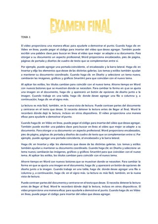 El documento describe las nuevas características y funciones de Microsoft Word que mejoran la presentación y formato de documentos, incluyendo la inserción de video, temas coordinados, botones de diseño simplificado, y una vista de lectura mejorada. Word también facilita la creación de portadas, encabezados, pies de página y tablas de manera profesional.