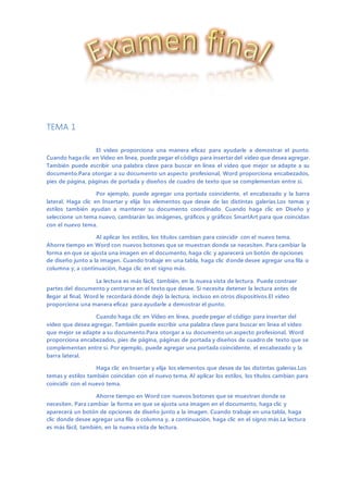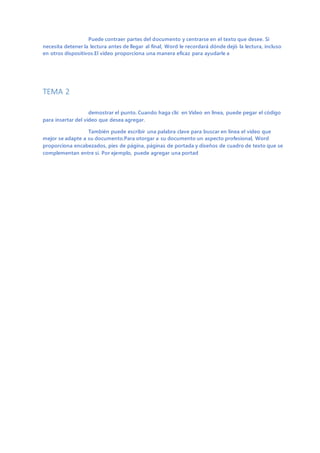 El documento proporciona información sobre las nuevas funciones y mejoras en Microsoft Word. Estas incluyen la capacidad de insertar videos en línea, aplicar temas y estilos para mantener la coherencia del documento, y usar nuevos botones y vistas que ahorran tiempo, como la vista de lectura.