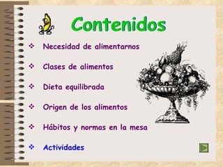 El documento habla sobre la necesidad de una alimentación equilibrada a lo largo de la vida y las clases principales de alimentos, incluyendo lácteos, carnes, cereales, verduras y frutas. También cubre el origen de los alimentos, ya sea animal, vegetal o mineral, y enfatiza la importancia de comer con moderación y respetar los horarios de las comidas.