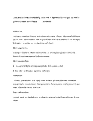 La terapia gestalt es una terapia centrada en el presente ("aquí y ahora") que busca ayudar a las personas a comprender sus comportamientos a través de la introspección directa y la reexperimentación de experiencias pasadas. Se basa en principios holísticos donde el todo es más que la suma de las partes, y busca que el cliente asuma responsabilidad por sí mismo a través del autoconocimiento.
