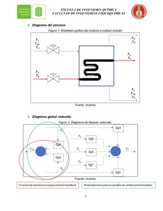 El documento presenta el modelado y simulación de un sistema de control en lazo cerrado para la evaporación de una solución de NaOH. Se incluyen diagramas del proceso y del sistema de control, así como las funciones de transferencia de cada elemento. Adicionalmente, se realizó la sintonización de Ziegler-Nichols para controladores P, PI, PD y PID, y se simularon las respuestas a perturbaciones con cada uno. El documento concluye presentando las conclusiones y recomendaciones del estudio.