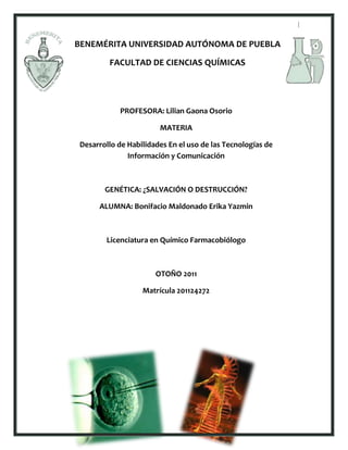 Este documento trata sobre los efectos de la ingeniería genética y las enfermedades genéticas. Explica que las mutaciones genéticas pueden causar trastornos como la anemia falciforme y la fibrosis quística. También describe los transtornos cromosómicos como el síndrome de Down y cómo afectan el desarrollo humano. Finalmente, advierte sobre los posibles usos negativos de la ingeniería genética y la necesidad de regularla con parámetros éticos.