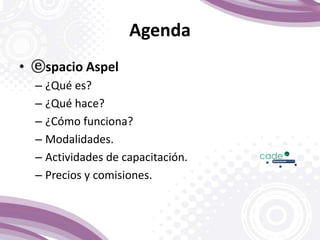 Espacio Aspel es una plataforma en línea para almacenar y compartir información financiera y contable de forma segura. Ofrece tres modalidades de servicio con diferentes capacidades de almacenamiento y número de usuarios, y permite la organización de información en carpetas. La contratación implica el registro en el sitio de Aspel y la elección de un plan de servicio, con precios que varían según la modalidad seleccionada.