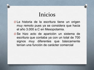 La escritura se originó hace aproximadamente 3,000 años a.C. en Mesopotamia como un sistema de 700 signos utilizados principalmente para fines comerciales. La escritura permite plasmar pensamientos en un soporte material a través de signos como letras que forman palabras. Escribimos para materializar un lenguaje a través de signos gráficos y desarrollar una forma de comunicación cuyos orígenes se remontan a hace más de 6,000 años.