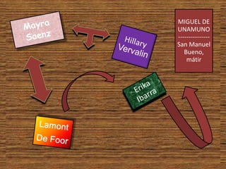 El documento resume la vida y obra del escritor español Miguel de Unamuno. Habla sobre su infancia religiosa, su educación y carrera académica, y su participación en la generación del 98. También analiza su filosofía existencialista influenciada por Kierkegaard y su novela San Manuel Bueno, mártir, que explora los conflictos entre la fe y la razón. Finalmente, resume las tensiones políticas y sociales entre tradicionalistas y progresistas que marcaron la época de Unamuno en España.