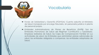 Este documento describe la financiación del Sistema General de Seguridad Social en Salud de Colombia. Explica los diferentes regímenes (contributivo y subsidiado), las fuentes de financiación como el Fondo de Solidaridad y Garantía, la Unidad de Pago por Capitación, el Sistema General de Participaciones y los copagos y cuotas moderadoras. También define conceptos clave como EPS, FOSSYGA y sus subcuentas.