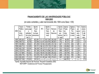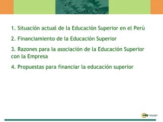 El documento discute la situación actual de la educación superior en Perú. Resalta que el financiamiento estatal ha disminuido constantemente, mientras que la matrícula universitaria ha crecido rápidamente. Propone que las universidades privadas y públicas deben asociarse más con las empresas para obtener financiamiento adicional y alinear mejor la oferta educativa con las necesidades del mercado laboral.
