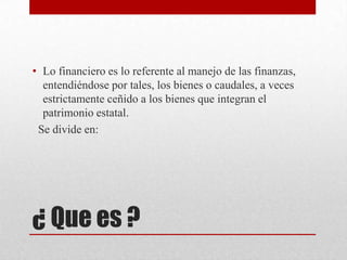 El documento define lo financiero como el manejo de las finanzas o bienes patrimoniales. Explica que lo financiero se divide en valor futuro y valor presente. El valor futuro es la cantidad obtenida de invertir capital a interés durante cierto número de períodos, mientras que el valor presente permite saber cuánto dinero se puede invertir para tener utilidades en varios períodos usando una fórmula dada. Ambos conceptos se usan para evaluar proyectos financieramente.