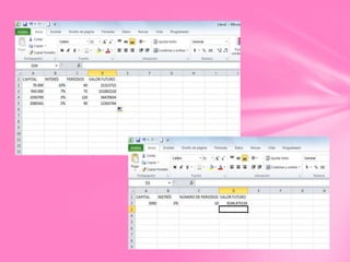 Este documento describe conceptos financieros como valor futuro y valor presente. Explica cómo calcular el valor futuro usando la fórmula VF=C(1+i)^n y cómo calcular el valor presente usando la fórmula VP=C/(1+i)^n. Luego proporciona ejemplos numéricos para practicar cálculos de valor futuro, valor presente y número de períodos.