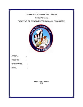 Este documento proporciona información básica sobre una clase en la Universidad Autónoma Gabriel René Moreno en Santa Cruz, Bolivia en 2013. Se incluye el nombre de la universidad, la facultad, la materia, el docente y la fecha pero no se proporcionan detalles sobre el contenido de la clase.