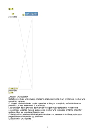 Este documento describe los pasos para realizar una evaluación de proyecto de inversión, incluyendo un análisis de mercado, técnico, económico y socioeconómico. Explica que la evaluación determina la viabilidad económica y social de un proyecto para asignar recursos de manera eficiente. También cubre criterios como el valor presente neto y la tasa interna de retorno para medir la rentabilidad de una inversión.