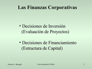 El documento presenta una introducción a la teoría de las finanzas corporativas. Explica que existen dos decisiones principales: inversiones (evaluación de proyectos) y financiamiento (estructura de capital). También resume las propuestas de Modigliani y Miller sobre cómo la estructura de capital no afecta el valor de la empresa. Finalmente, introduce conceptos clave como flujo de caja descontado, tasa de descuento y retorno sobre el capital invertido para valuar empresas.