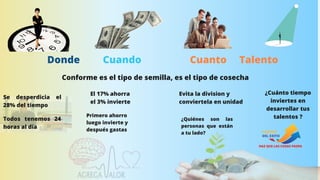 El documento aborda la importancia de conocer y desarrollar el propósito de vida personal, enfrentando obstáculos y transformaciones a través de la autoconciencia y el autoconocimiento. Se enfatiza en la gestión del tiempo y las finanzas personales como herramientas clave para alcanzar metas y vivir de acuerdo al propio propósito. Además, invita a reflexionar sobre la influencia que ejercemos en los demás y cómo nuestras historias personales moldean nuestro destino.