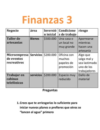 El documento presenta tres opciones de negocio con diferentes requisitos de inversión inicial y condiciones de trabajo. Un taller de artesanías requiere $500,000 e instalaciones modestas. Una microempresa de eventos requiere $200,000 y oficinas con equipos de promoción. Trabajar en cabinas telefónicas requiere $200,000 y un espacio pequeño.