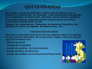 Este documento presenta un resumen de las lecciones sobre finanzas impartidas en el grado 10-1 en el Instituto Educativo Técnica John F. Kennedy. Incluye definiciones de finanzas, estados financieros, asesores contables y administrativos, inversiones, y partes del balance general como activos corrientes y otros activos.
