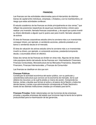 El documento describe las finanzas como las actividades relacionadas con el intercambio de bienes de capital entre individuos, empresas y estados. Explica que el estudio académico de las finanzas se divide en dos ramas principales: finanzas corporativas y valuación de activos. También clasifica las finanzas en públicas y privadas. Finalmente, destaca la relación infinita entre las finanzas y la administración, ya que el objetivo es administrar bienes, ingresos y gastos para alcanzar las metas fijadas.