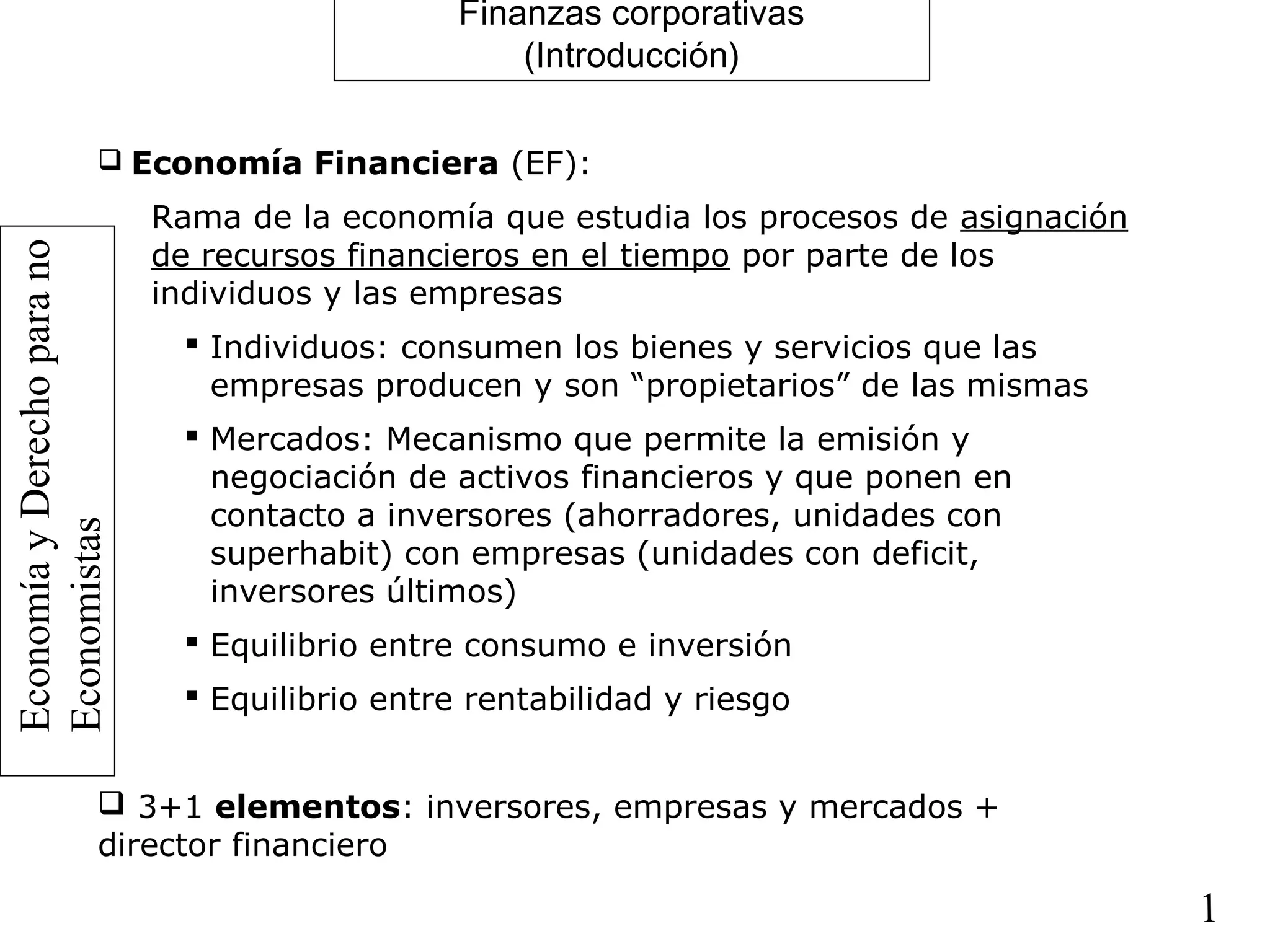 El documento introduce los conceptos básicos de las finanzas corporativas. Explica que el director financiero tiene la misión de maximizar la riqueza de los accionistas adoptando las decisiones óptimas de inversión, financiación y dividendos. Estas decisiones influyen en el valor de mercado de la empresa y deben adoptarse considerando los flujos de efectivo esperados, el coste de capital y el riesgo asociado a cada proyecto de inversión.