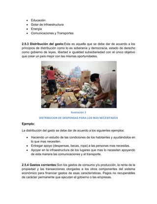 El documento describe los conceptos clave de las finanzas públicas. Define el ingreso público como los recursos que obtiene el sector público del sistema económico para financiar sus intervenciones. Explica el gasto público como el flujo que determina el resultado económico-patrimonial producido por operaciones presupuestarias y no presupuestarias. Además, señala que la distribución del gasto debe realizarse de acuerdo a principios como la soberanía y la igualdad de oportunidades. Finalmente, diferencia entre gastos corrient