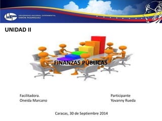 El documento presenta una unidad sobre finanzas públicas en Venezuela. Explica conceptos clave como la actividad financiera del estado, sus objetivos y evolución en Venezuela. También cubre la Ley Orgánica de Administración Financiera del Sector Público, que rige este ámbito y contiene 10 títulos y artículos relevantes.