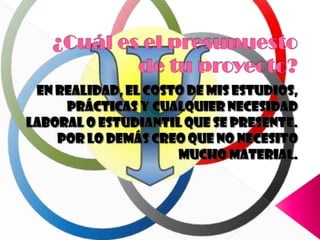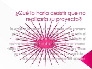 El autor quiere iniciar un proyecto para ayudar a personas que enfrentan problemas internos y situaciones difíciles mediante tratamientos científicos y espirituales. Su objetivo principal es ver un cambio positivo en la salud mental y emocional de sus pacientes y que lleven una vida más plena. El proyecto beneficiaría a nivel personal, social y ambiental.